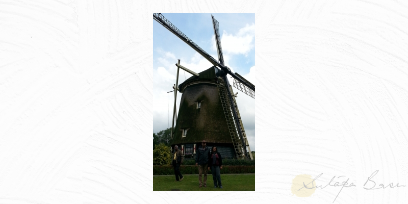 Driving out of Amsterdam on the way to Brussels, we came upon a true-blue windmill. There was a general clamouring for photo-ops. We posed with the old, dark mill, its four huge hands spread eagled across the blue sky splattered with fleecy clouds.