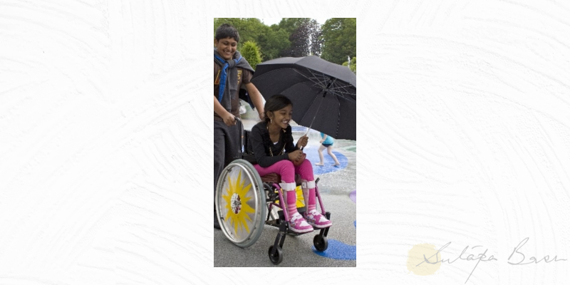 Next morning, Pema was up early. She had a bath, wore a new dress and tied red ribbons in her hair. Her mother gave her some hot porridge in yak’s milk. Abu and his friends ran in. Together they pushed Pema’s wheelchair up the smooth path to school. The teachers were at the gate to welcome the children.